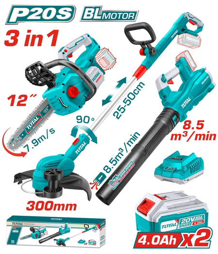 COMBO INALAMBRICO 20V MOTOSIERRA INALAMBRICA 12" + GUADAÑADORA + SOPLADORA + 2 BATERIAS 4.0 AH Y CARGADOR INDUSTRIAL SUPER TOTAL (UTOSLI241189)