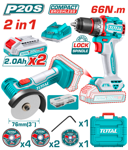 COMBO INALAMBRICO 20V X 2 PZS TALADRO 1/2 66 N.M + MINI PULIDORA 3" INCLUYE 2 BATERIAS 2.0 AH + CARGADOR + 7 DISCOS Y 47 ACCESORIOS INDUSTRIAL SUPER TOTAL