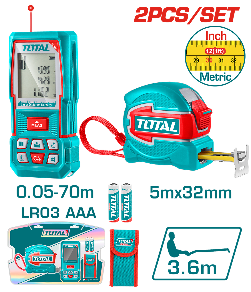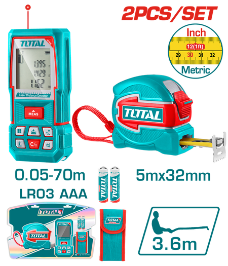 KIT DE MEDIDOR DE DISTANCIAS LASER 70 MTS + METRO 5 MTS HOJA 32MM INDUSTRIAL SUPER TOTAL (TLDD241201)