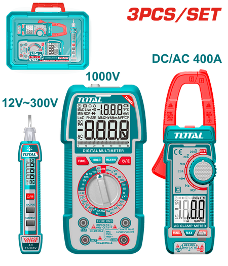 Comprobador de voltaje digital, pantalla digital LCD THTS33001Alarma de sonido y luz Apagado automático Indicación de batería baja Voltaje de prueba: CA 12-300 V Multímetro digital de 1000 V, TMT5310002Pantalla RMS TRUE 6000 cuentas Corriente CC/CA: 6000 uA/60 mA/600 mA/10 A Voltaje CC: 600 mV/6 V/60 V/600 V/1000 V Voltaje CA: 600 mV/6 V/60 V/600 V/750V Pinza amperimétrica digital CA/CC de 400 A, TMT762002 PantallaRMS TRUE 4000 cuentas Corriente CC/CA: 4 A/40 A/400A Voltaje CC/CA: 400 mV/4 V/40 V/ 600 VOtros:1 pila AAA LR03, THTS330013 pilas AAA LR03, TMT53100022 pilas AAA LR03, TMT762002
